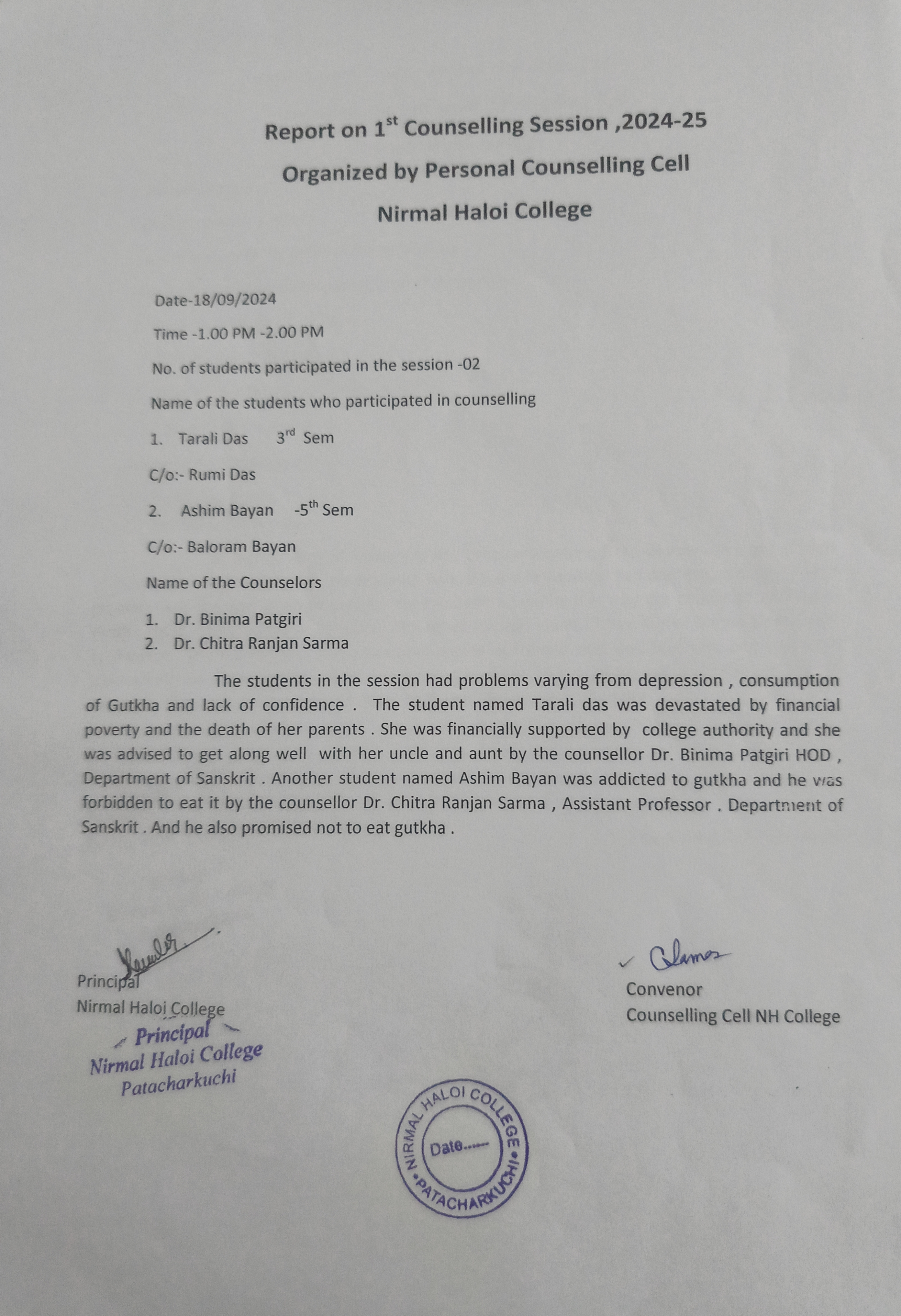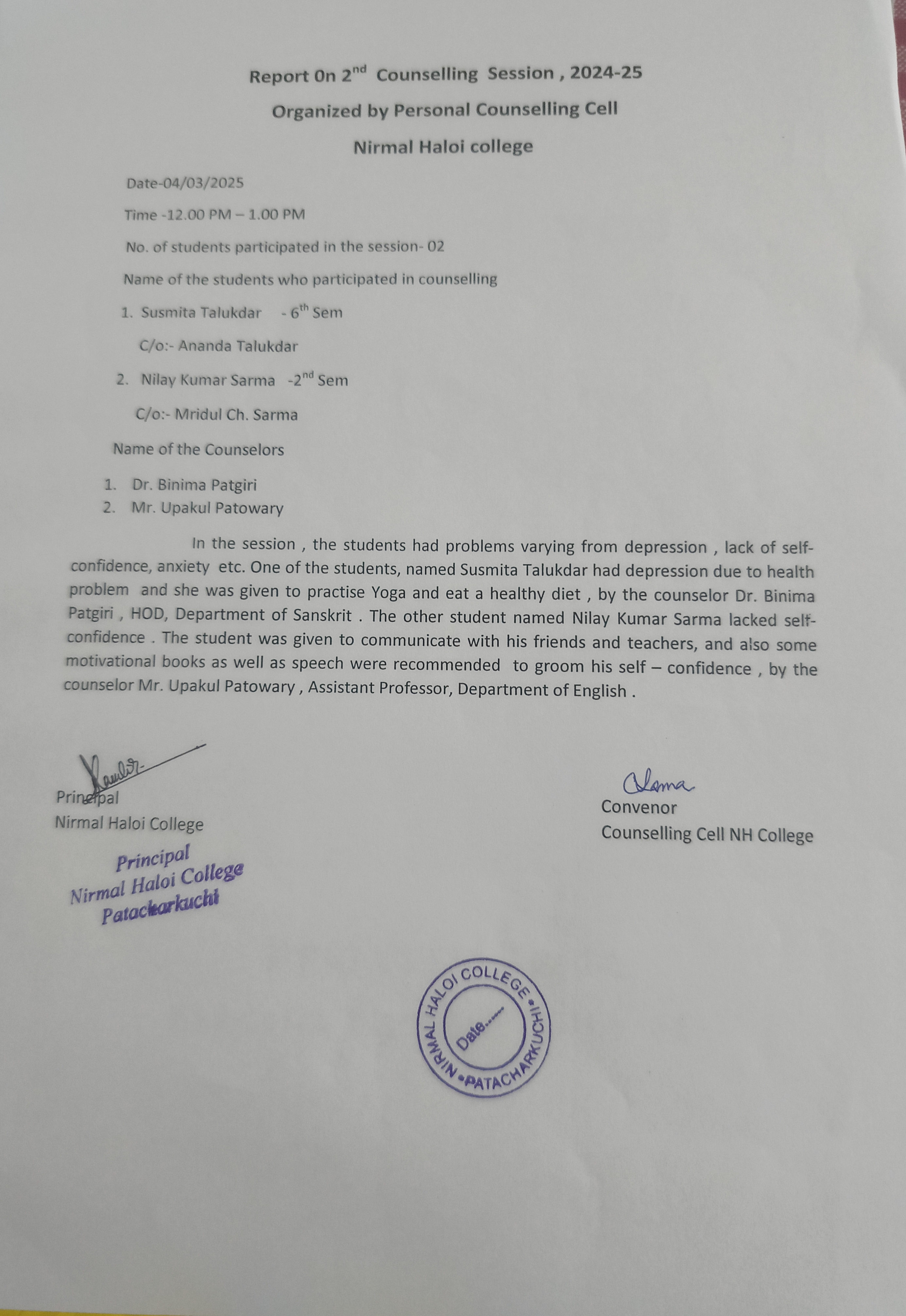 The career counselling and guidance cell at Nirmal Haloi College plays a pivotal role in shaping the future of our students by providing comprehensive guidance and support. NH College career counselling cell, has now become a very important part of students’ support service in the college, and has been playing a very important role by carrying out various important activities and organising a various event for the greater interest of the students.
